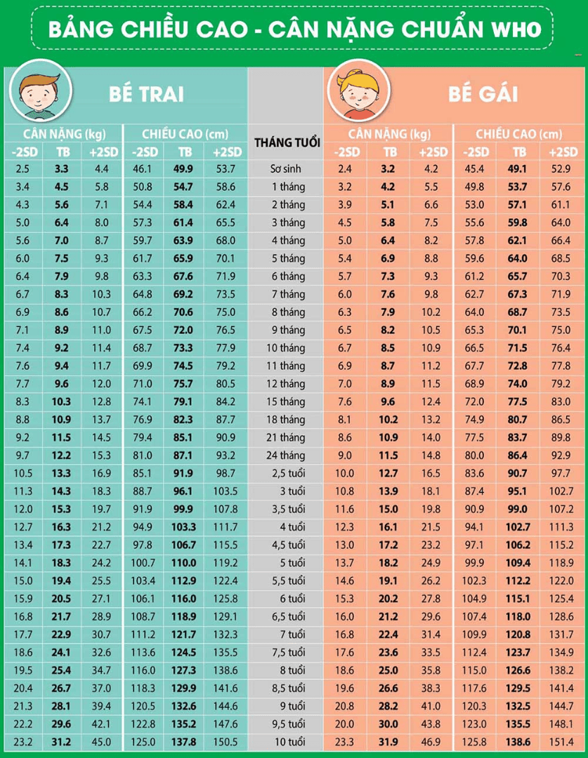 Bảng chiều cao cân nặng của trẻ từ 0 đến 10 tuổi theo chuẩn WHO